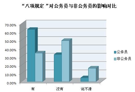 截至2013年12月20日10時(shí),共收到網(wǎng)絡(luò)問卷2442份,48.4%的受訪者認(rèn)為“八項(xiàng)規(guī)定”對(duì)個(gè)人生活有影響,其中公務(wù)員群體認(rèn)為“八項(xiàng)規(guī)定”帶來的最大影響是“公務(wù)吃請(qǐng)少了,能抽出更多時(shí)間陪伴家人”和“津貼補(bǔ)貼獎(jiǎng)金少了,勒緊褲帶過日子”,非公務(wù)員群體認(rèn)為“八項(xiàng)規(guī)定”帶來的最大影響是“酒店、高端會(huì)所門外的公務(wù)用車少了”和“遇到領(lǐng)導(dǎo)考察工作時(shí),地毯鮮花迎送領(lǐng)導(dǎo)的情況少了”。