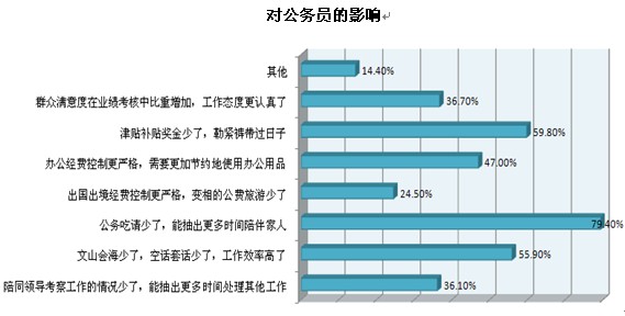 還有三到五成受訪公務(wù)員認(rèn)為“辦公經(jīng)費(fèi)控制更嚴(yán)格,需要更加節(jié)約地使用辦公用品”、“群眾滿意度在業(yè)績考核中比重增加,工作態(tài)度更認(rèn)真了”和“陪同領(lǐng)導(dǎo)考察工作的情況少了,能抽出更多時(shí)間處理其他工作”是“八項(xiàng)規(guī)定”帶來的幾大影響。
