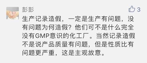 也有網(wǎng)友認為:“生產(chǎn)記錄造假一定是生產(chǎn)有問題,沒問題為什么造假?他們可不是沒有GMP意識的化工廠。當然記錄造假不是說產(chǎn)品質量有問題,但是性質比問題更嚴重,這是主觀故意。”